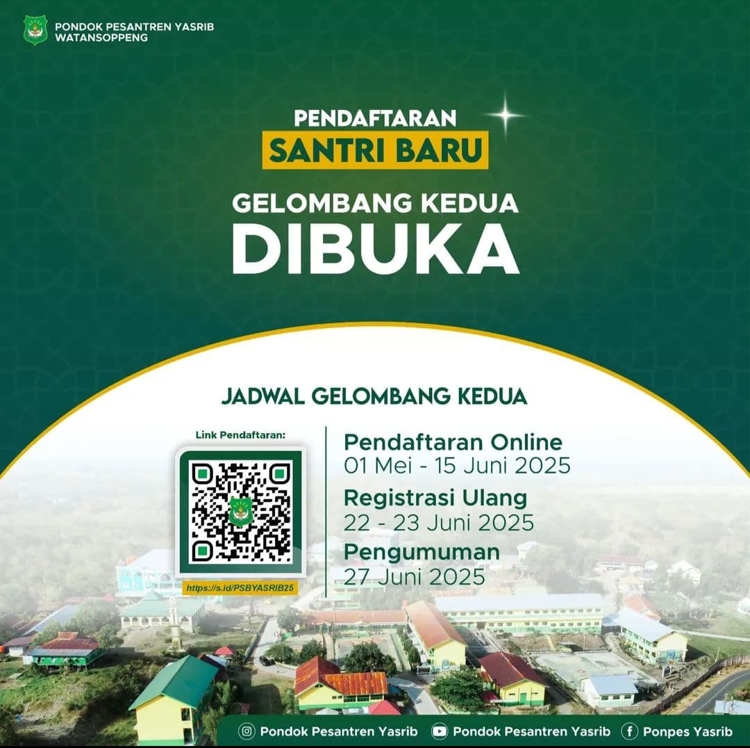Watansoppeng – Pondok Pesantren Yasrib Watansoppeng kembali membuka kesempatan bagi calon santri untuk bergabung melalui Pendaftaran Santri Baru Gelombang Kedua. Pendaftaran online telah dibuka mulai tanggal 1 Mei hingga 15 Juni 2025.