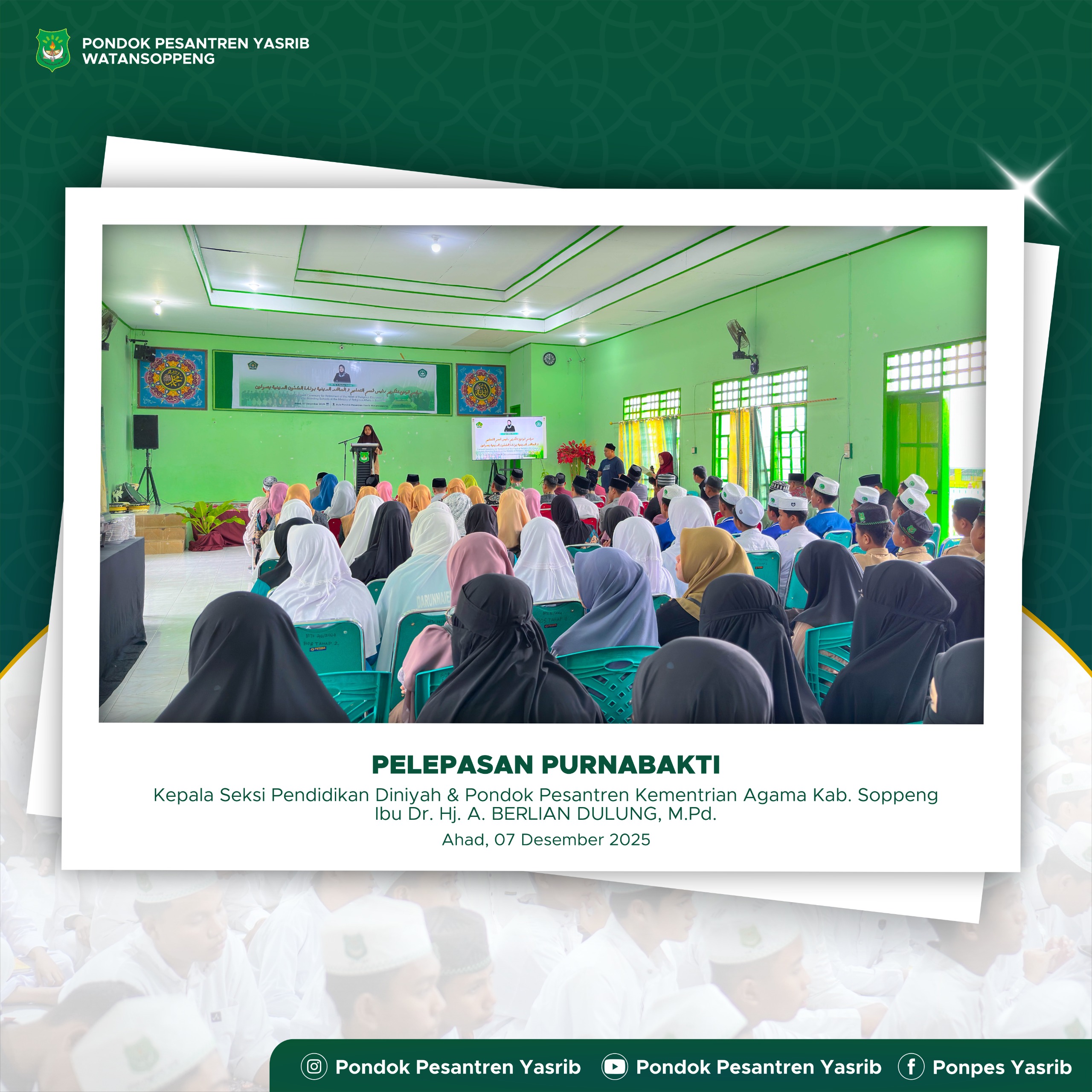 Sebelum pelaksanaan upacara dimulai, kegiatan diawali dengan pemberian penghargaan kepada santri berprestasi di bidang pencak silat tingkat provinsi. Penghargaan tersebut diberikan kepada lima orang santri yang telah mengharumkan nama Pondok Pesantren Yasrib melalui prestasi yang diraih pada ajang kompetisi tingkat provinsi.